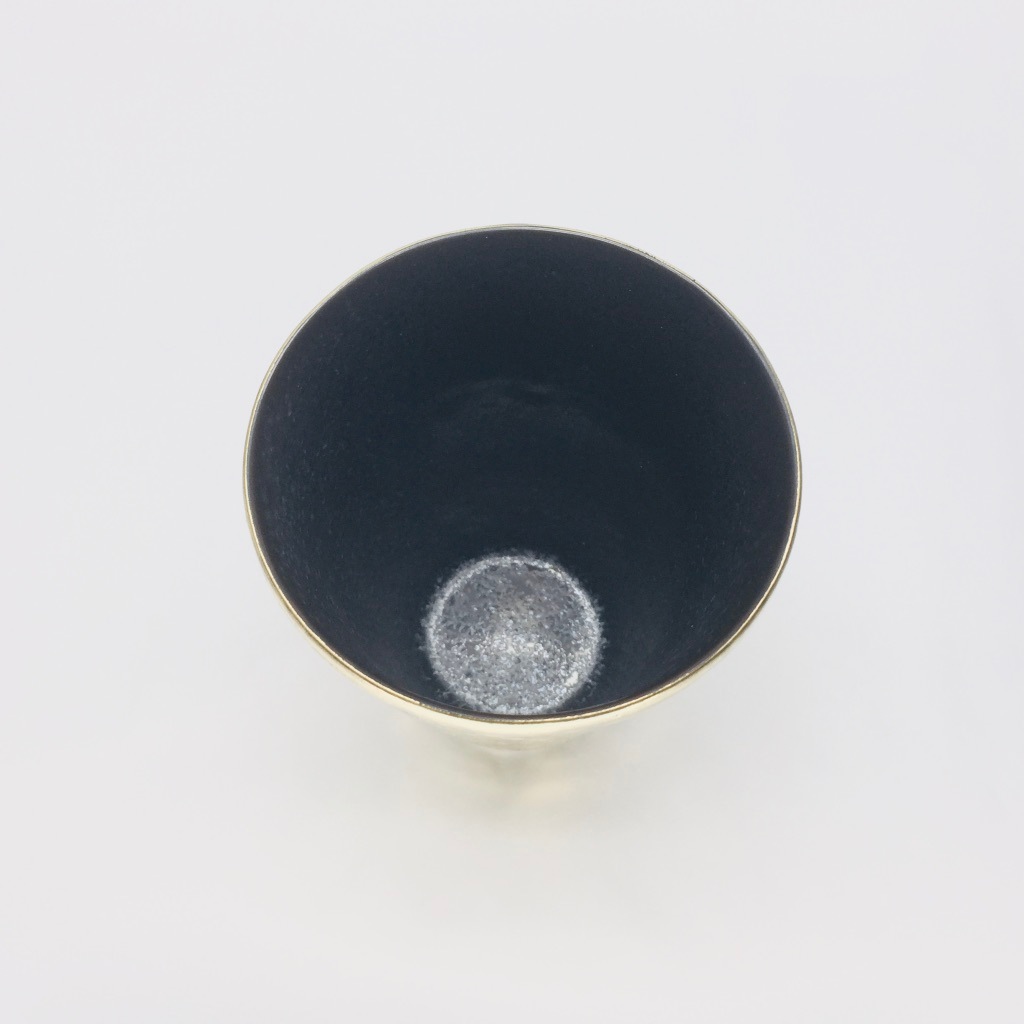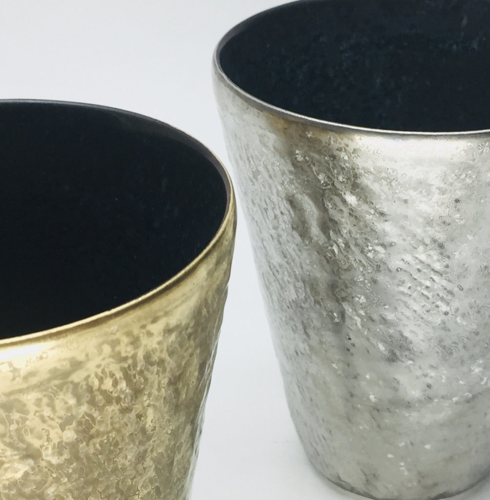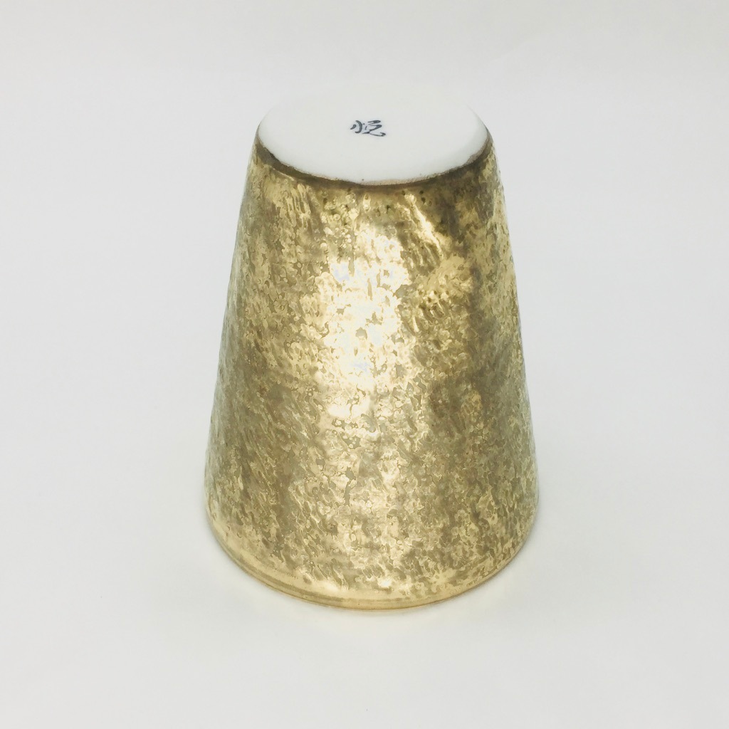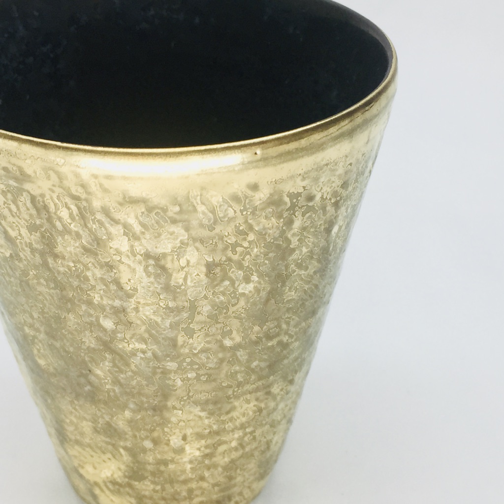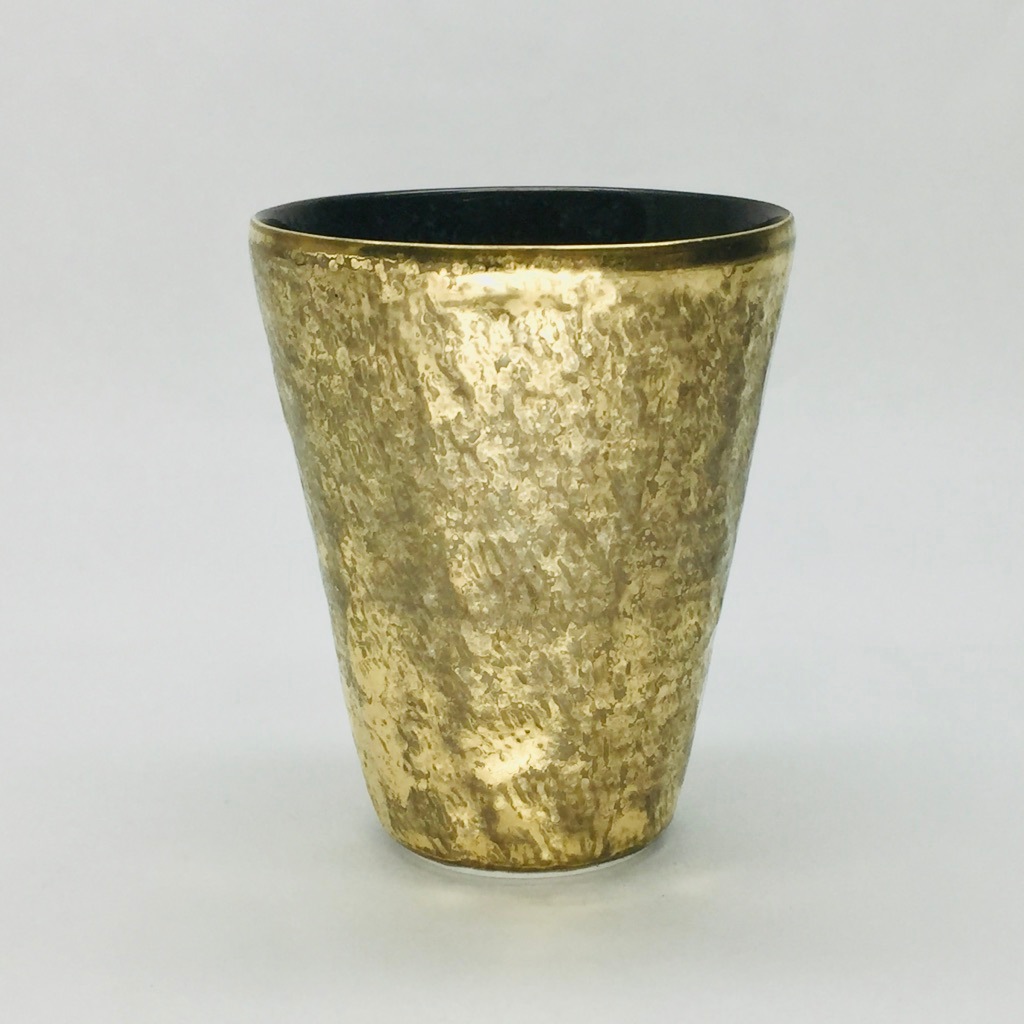 カップの外側は「布目(ぬのめ)」、技法の一つでもありますが、布目とは布を押し当てた様な模様を指します。加えてその上に刷毛目で大胆に色付けされた金も魅力的です。焼酎、ビール、ソフトドリンクなど幅広くお使い頂ける形状ですので、ご自宅使いやギフトにも喜ばれる商品となっています。