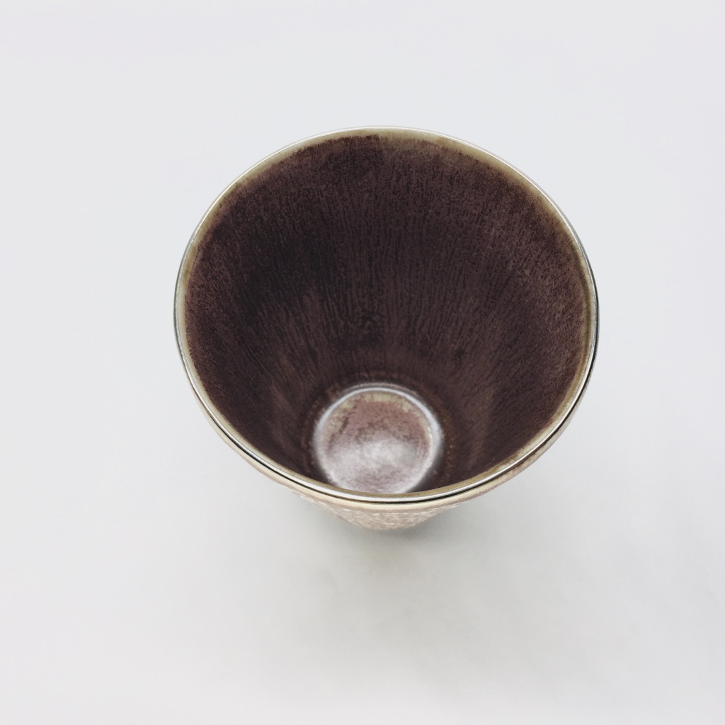 カップの外側は「布目(ぬのめ)」、技法の一つでもありますが、布目とは布を押し当てた様な模様を指します。外側は栗皮色(くりかわいろ:黒みがかった赤褐色)、渕にはさり気なく銀が塗られているカップです。焼酎、ビール、ソフトドリンクなど幅広くお使い頂ける形状ですので、ご自宅使いやギフトにも喜ばれる商品となっています。