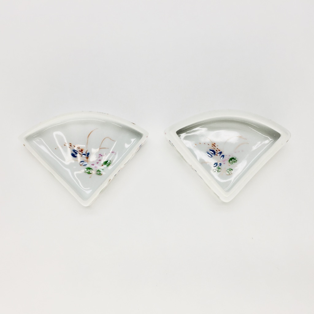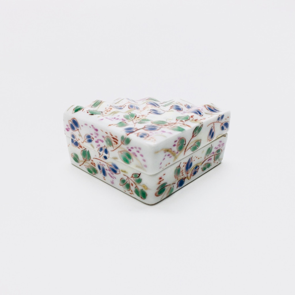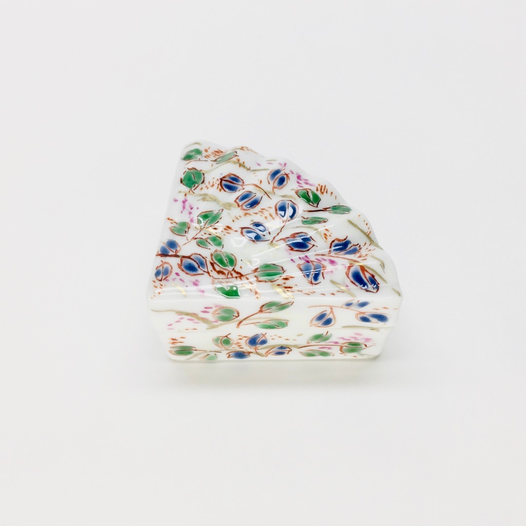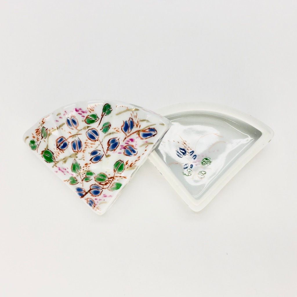 そんな扇型に絵柄は萩、秋草文様でもあり秋の七草の一つです。寄り添うように咲いている秋草は風情があり、うつろいゆく時の流れや人生観を感じさせる、日本的情緒溢れる文様の美しい香合です。