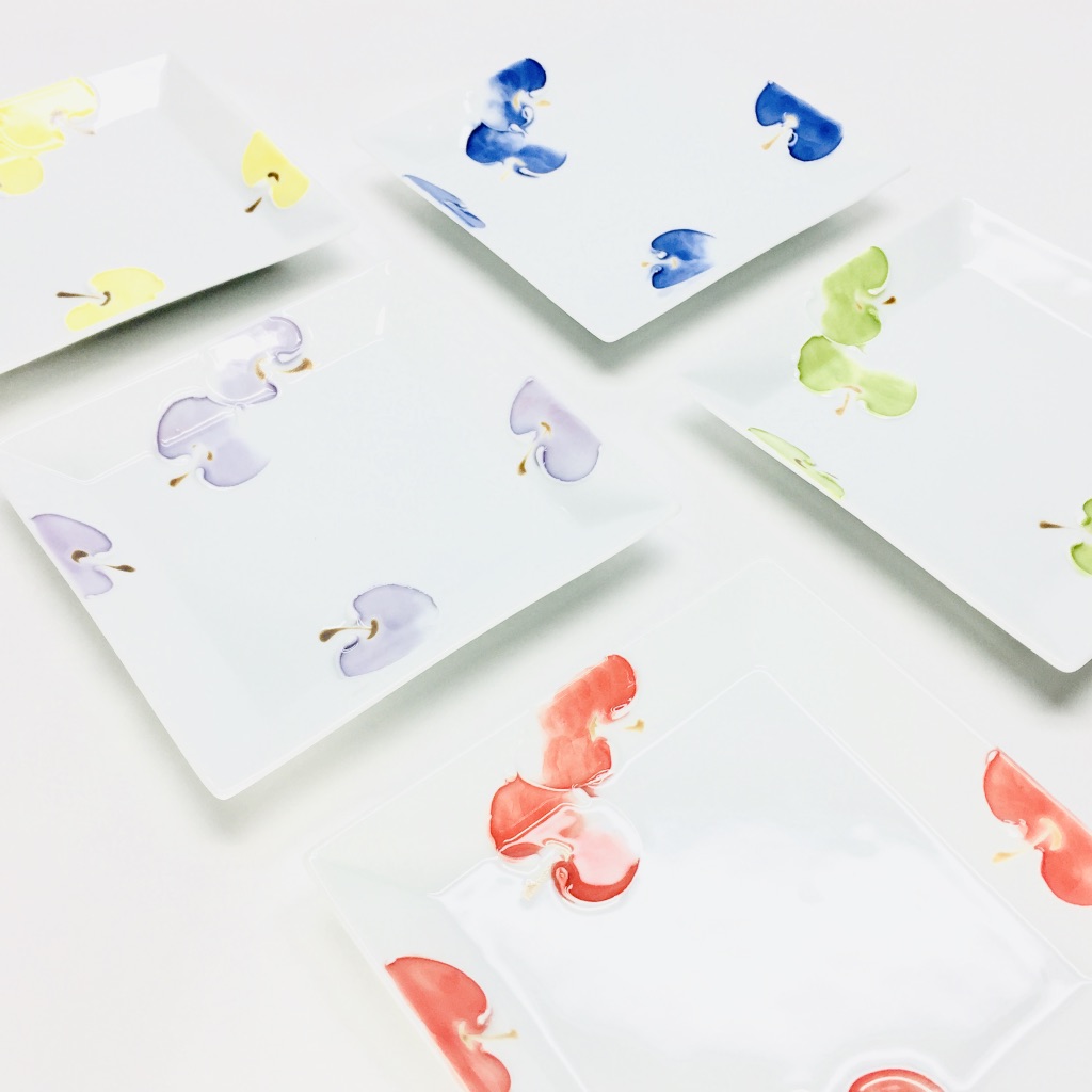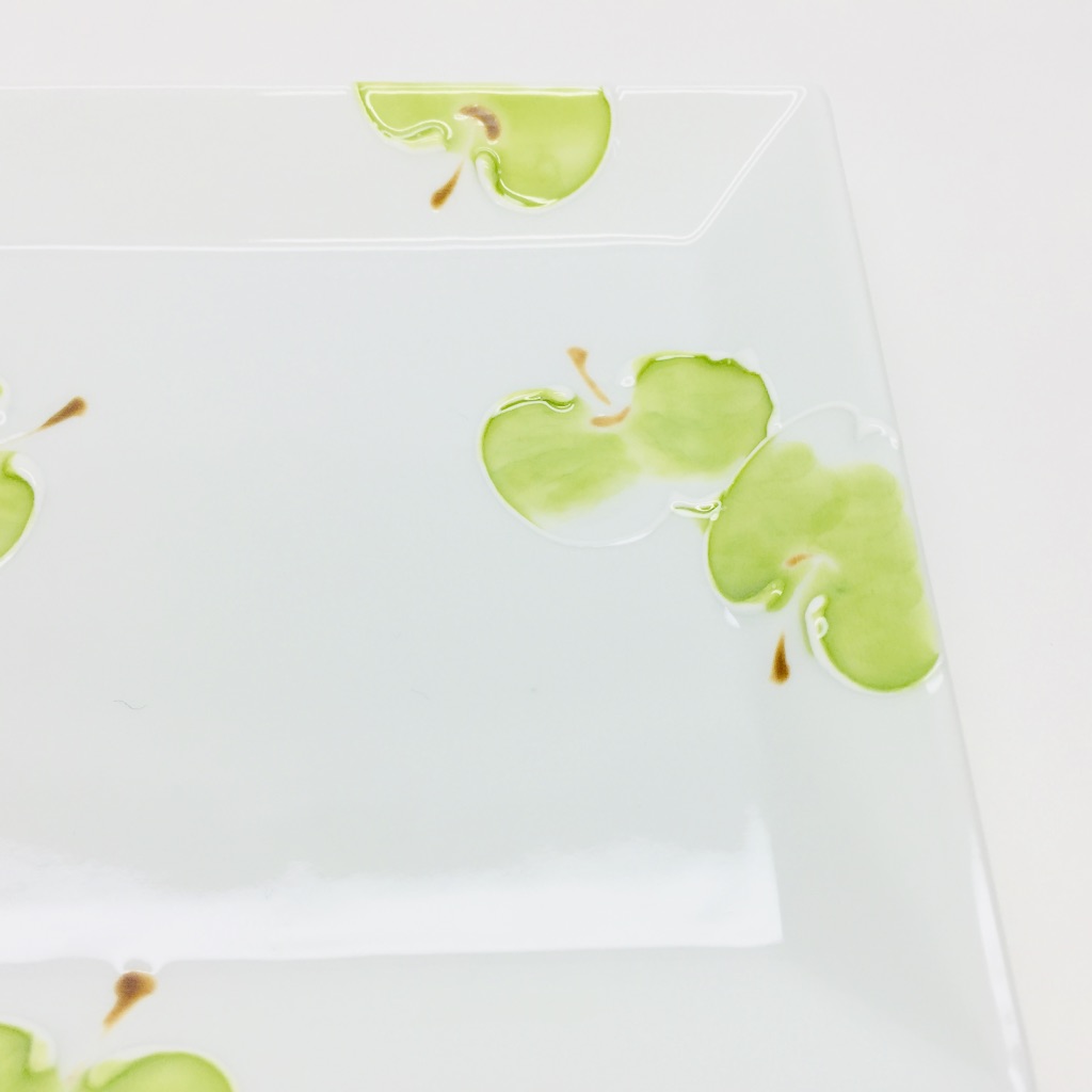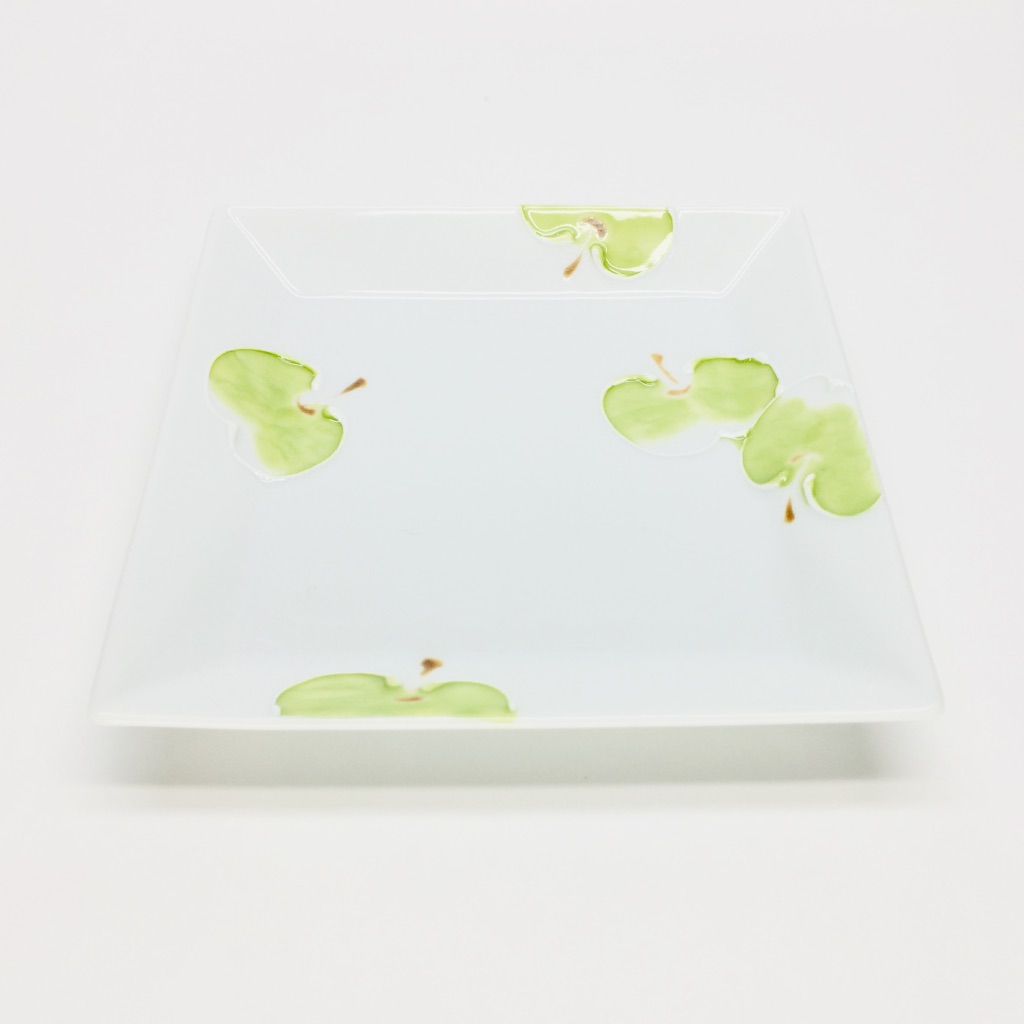 一珍(いっちん)と言う装飾技法があります。技法名の由来は諸説ありますが、描く際に「盛り上げの線」で仕上げる伝統的技法です。今回はそんな一珍の技法で可愛らしいりんごが描かれた正角小皿のご紹介です。