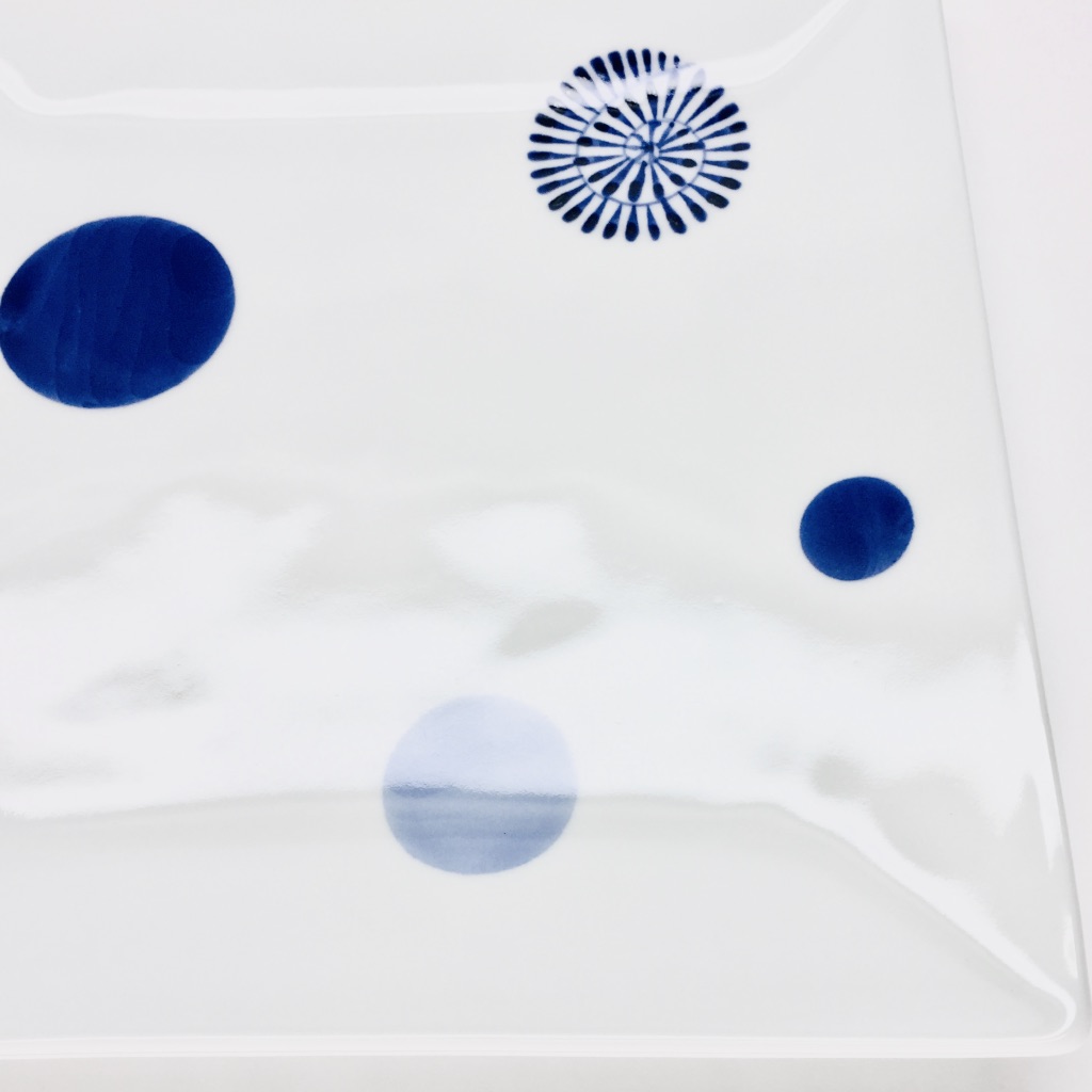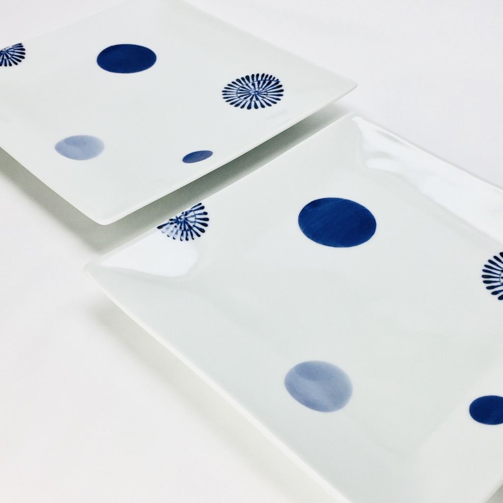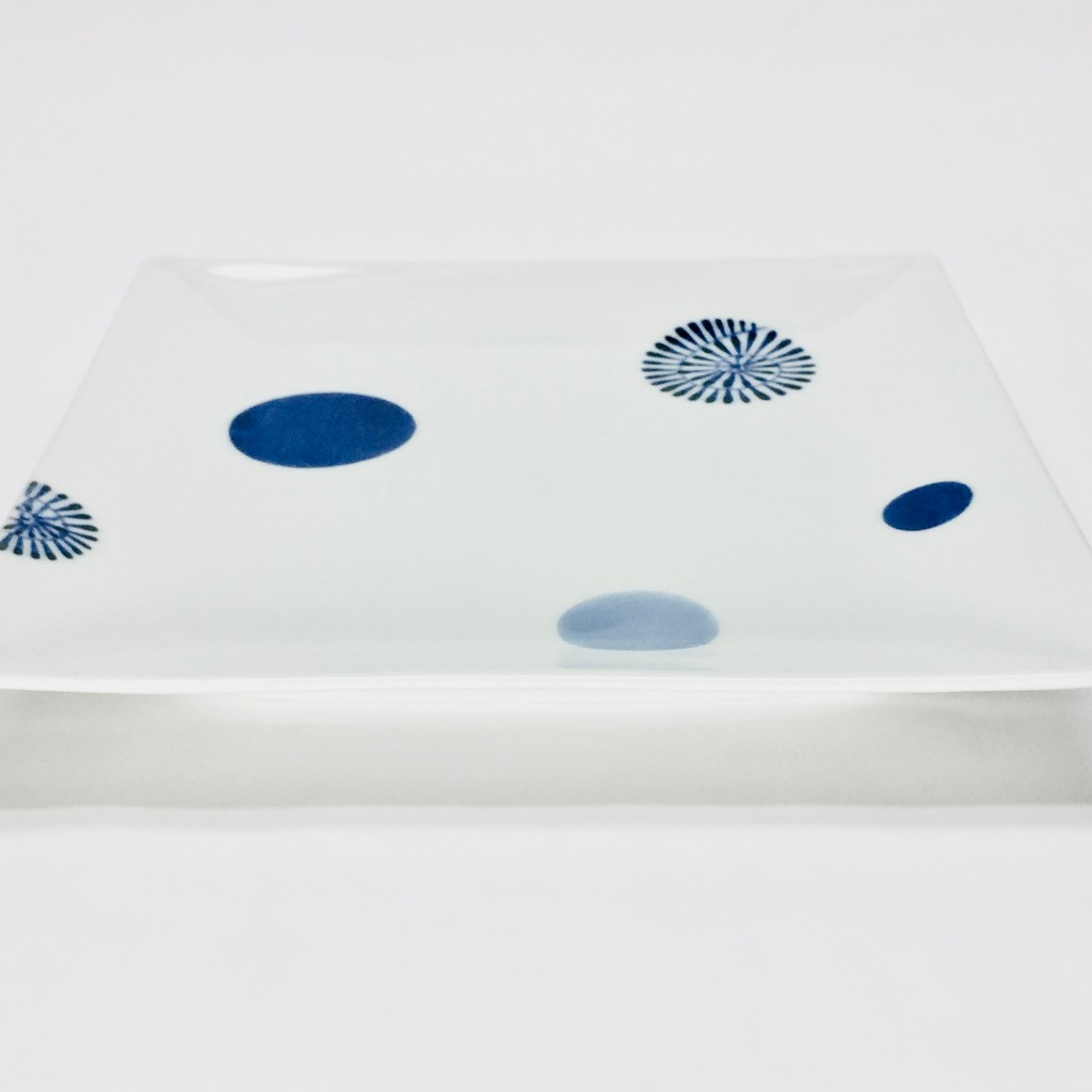 素敵な正角皿のご紹介です。絵柄は丸紋、空間を生かして控えめに散らした丸紋が特徴的です。濃淡ある丸紋、蛸唐草で描かれた丸紋が丁寧に絵付けされ、バランスよく可愛らしい雰囲気を出しています。魚料理から肉料理まで幅広くお使い頂ける器です。朝食のプレート使いとしても重宝します。