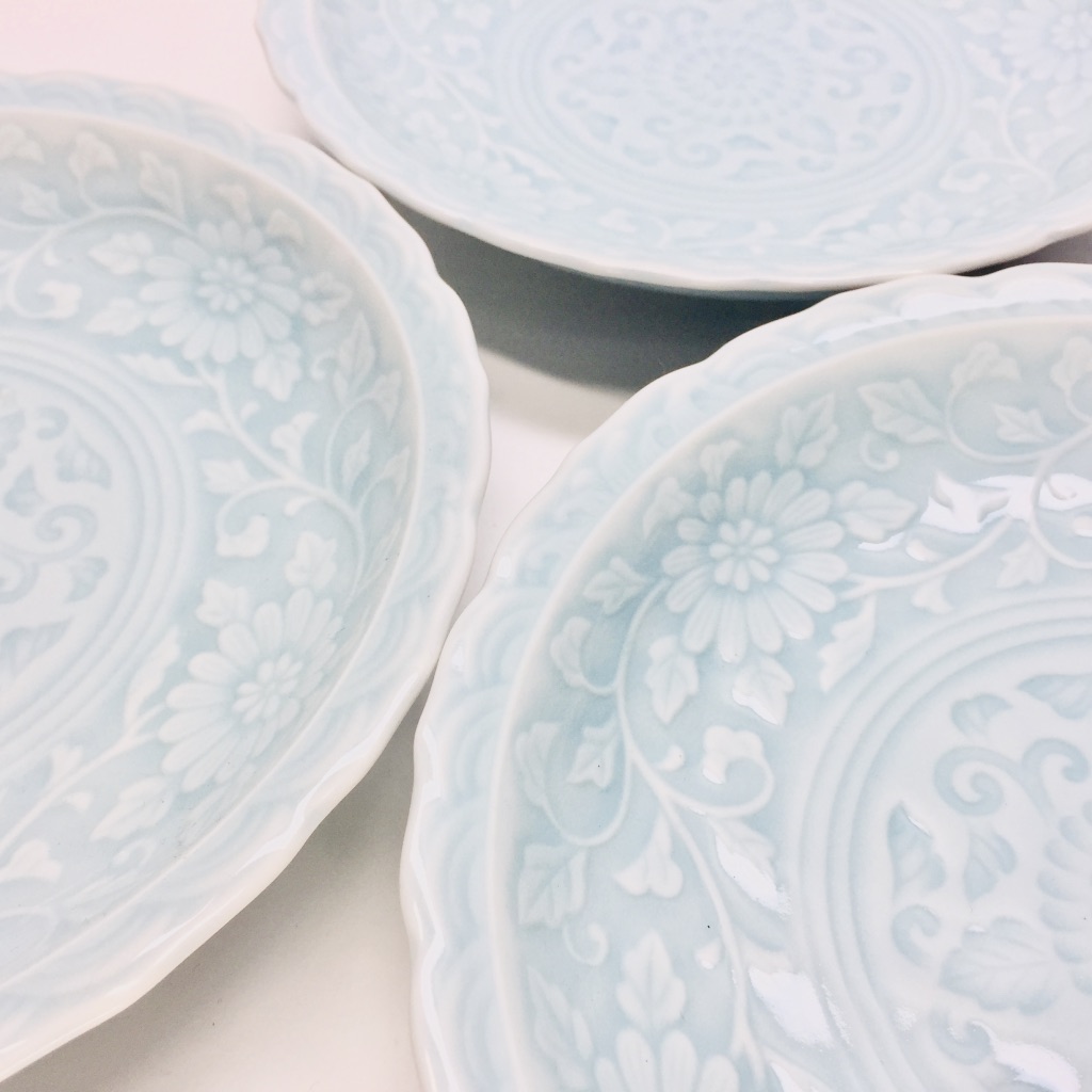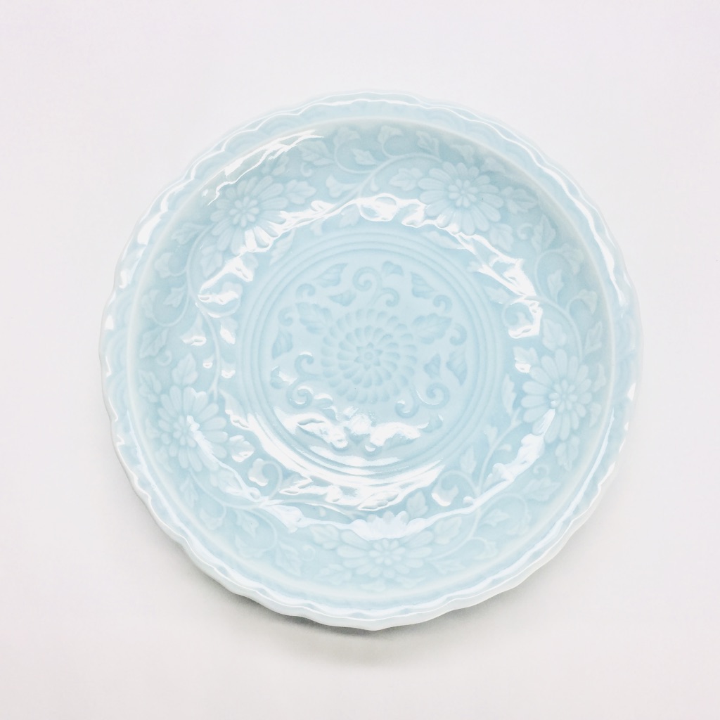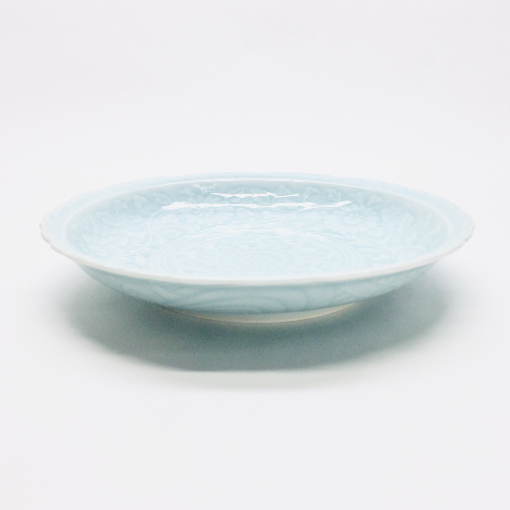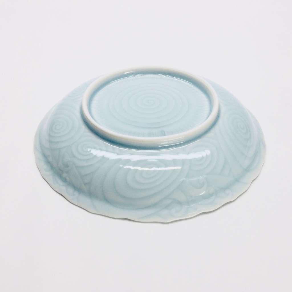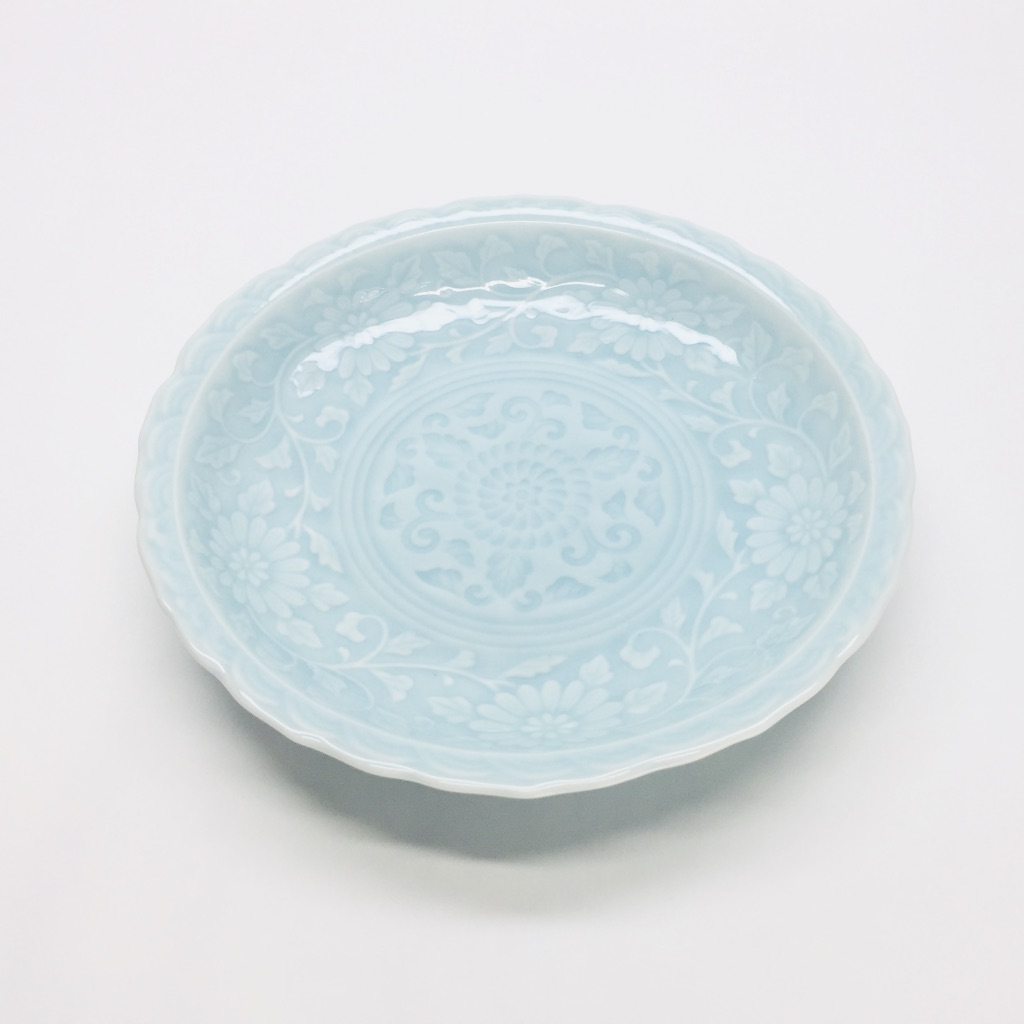 美しい唐草彫の文様に透き通るような青磁を施した、大変使い勝手の良い銘々皿のご紹介です。一品料理はもちろん、各自の取皿として日常の食卓で幅広くお使い頂けます。