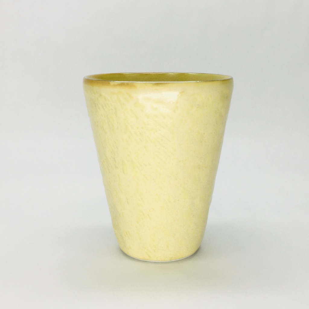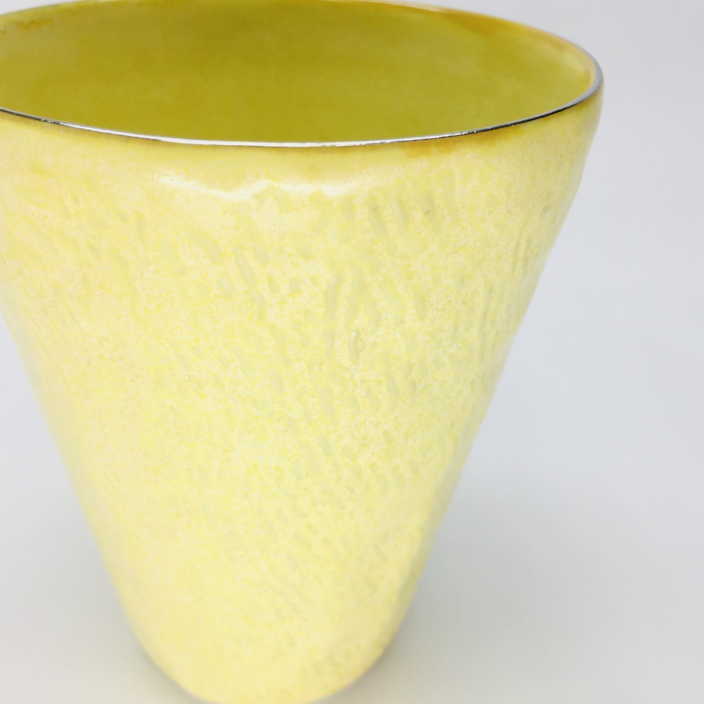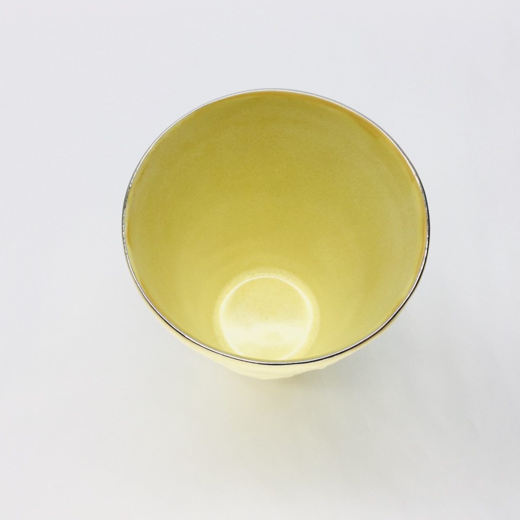 カップの外側は「布目(ぬのめ)」、技法の一つでもありますが、布目とは布を押し当てた様な模様を指します。外側はイエロー、渕にはさり気なく銀が塗られているカップです。焼酎、ビール、ソフトドリンクなど幅広くお使い頂ける形状ですので、ご自宅使いやギフトにも喜ばれる商品となっています。