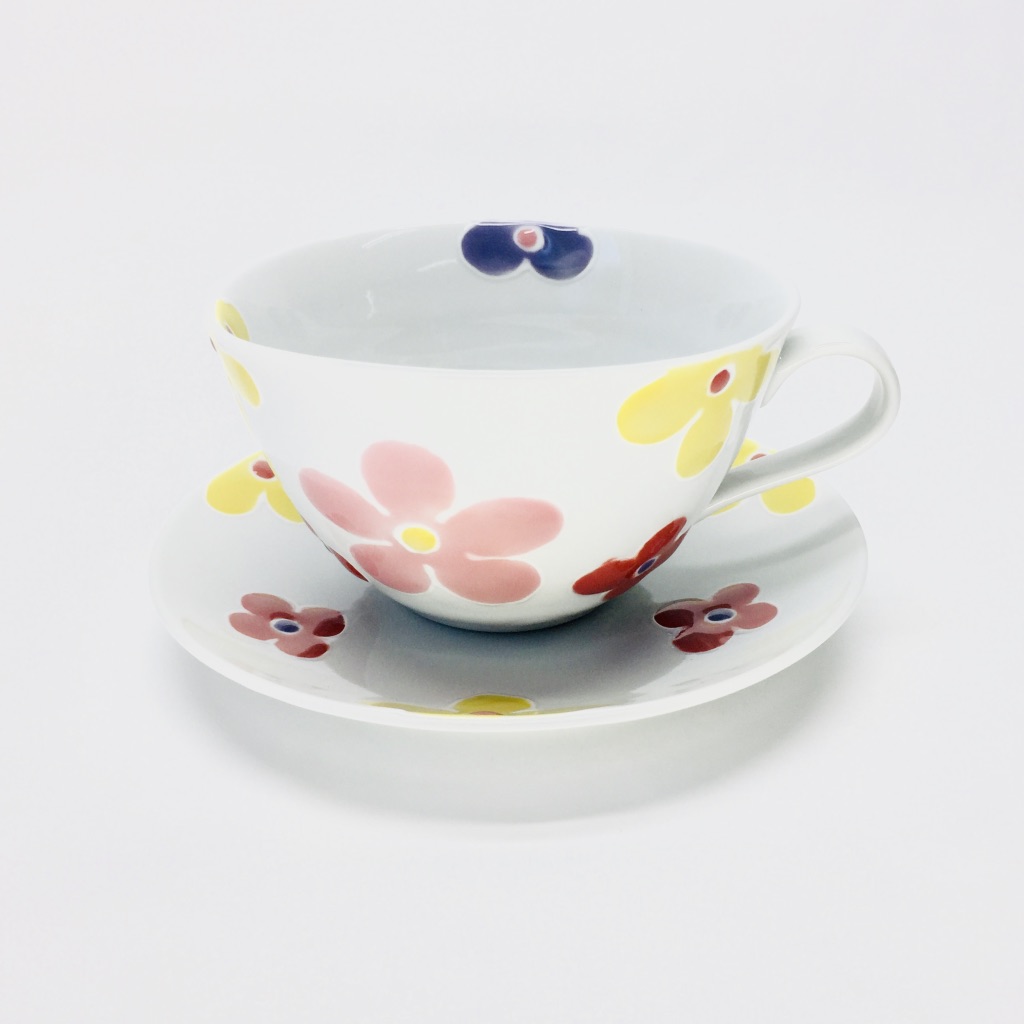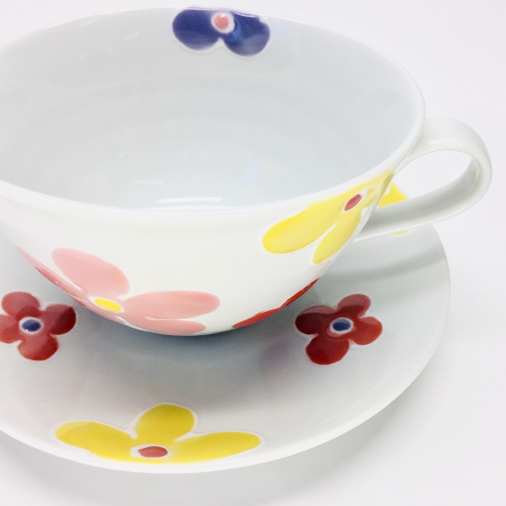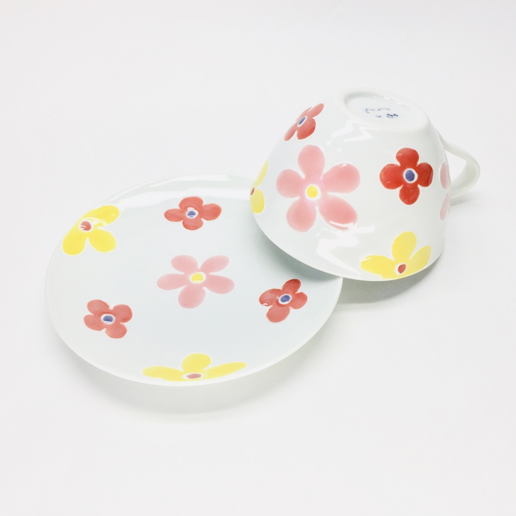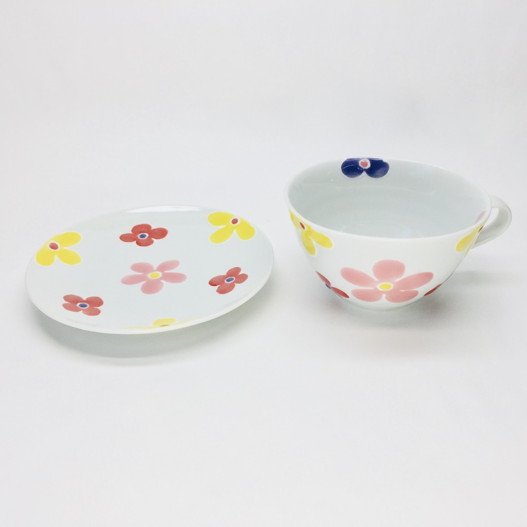 赤を基調とした可愛らしい花文様のスープマグ・丸皿の2点セットです。スープマグはスープ・汁物はもちろん、ご飯物としても。またスープマグのオススメの使い方として「納豆・卵」を混ぜるのにも大変重宝する形状です。