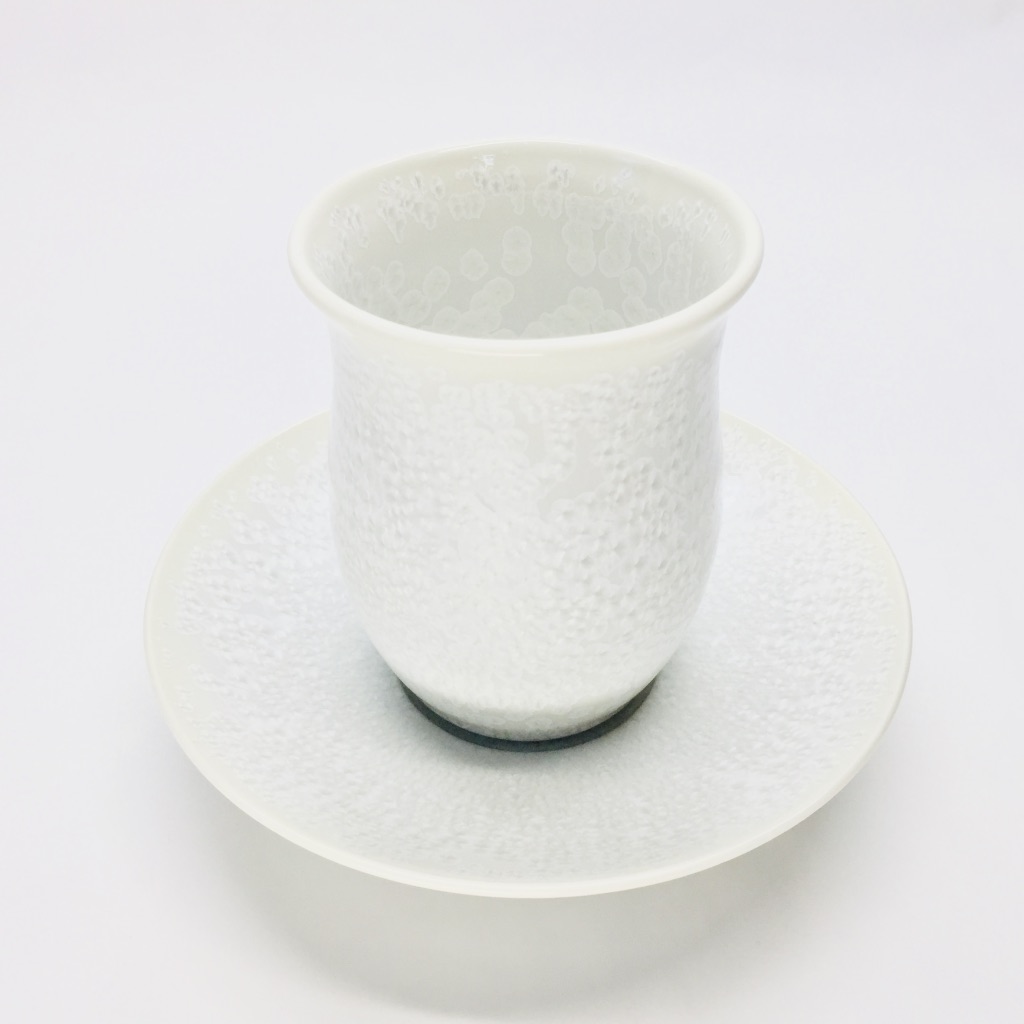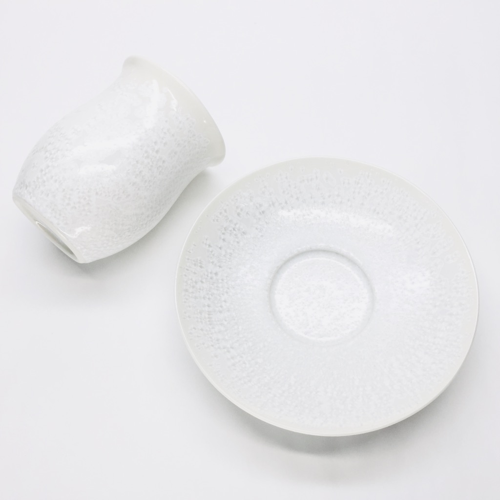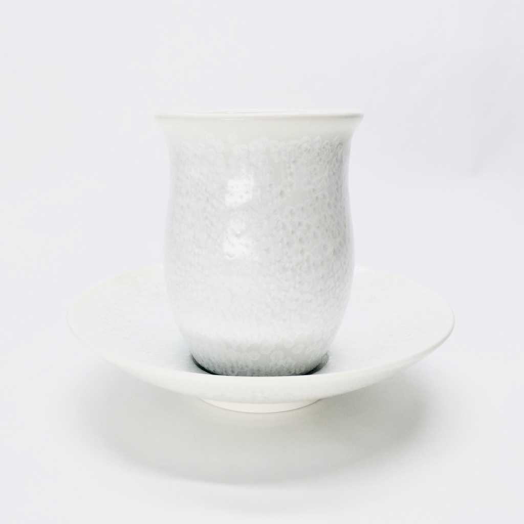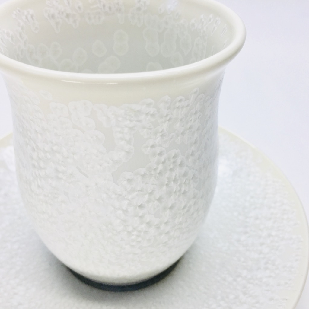 釉薬は真右ェ門窯の中でも玄人好みの「白天目」、雪のように美しく、結晶が散りばめられ彩られているこちらの【白雪】、大変贅沢なカップ&ソーサーとなっております。1個1個、馬場泰嘉氏により丁寧に制作される、通年限定商品となっております。